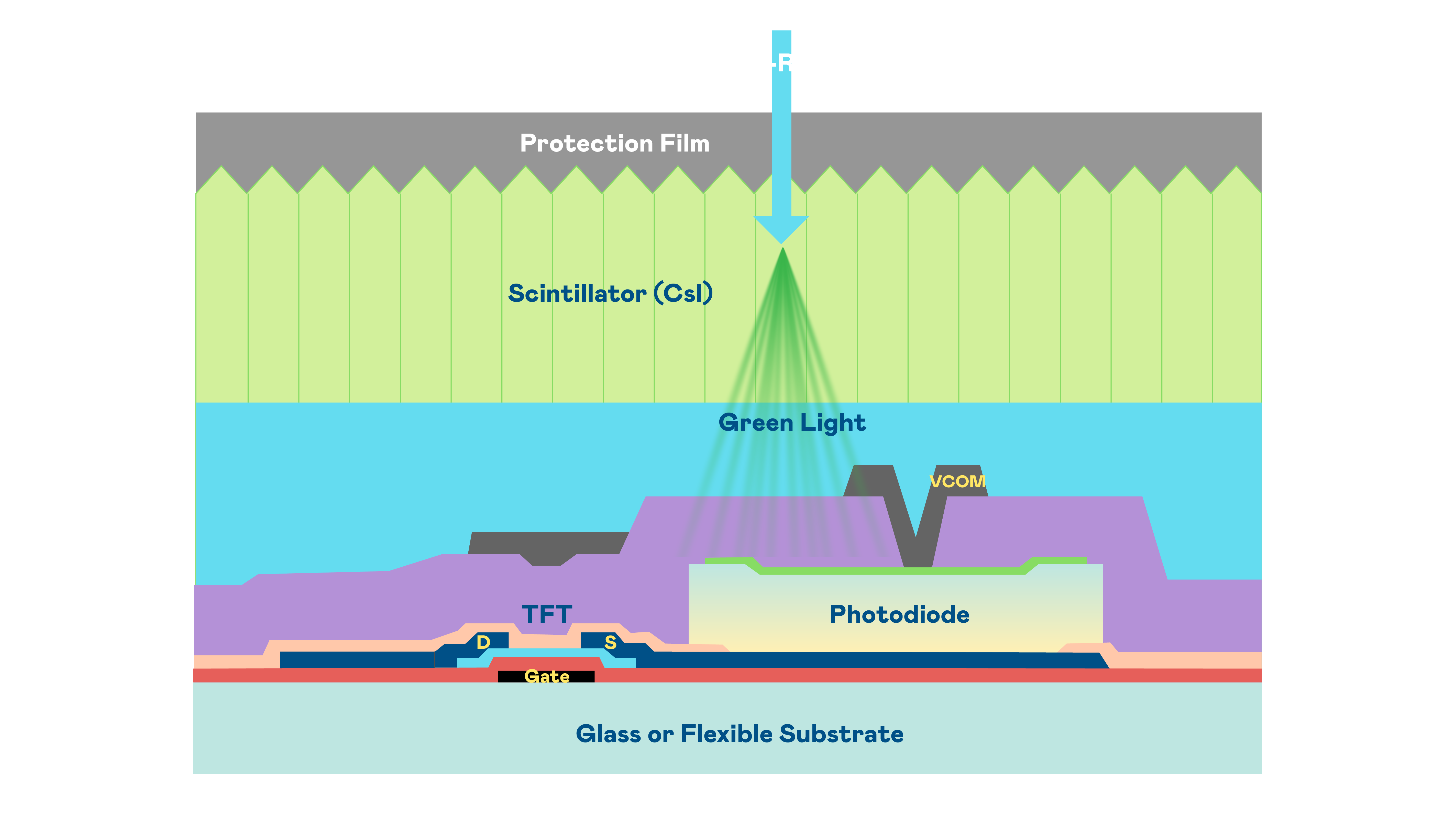 羞羞视频18的X光影像感測陣列使用薄膜電晶體 (TFT) 作為每個像素的讀取開關,搭配光電二極體(Photodiode)的光電轉換元件,用以感測X光影像訊號。